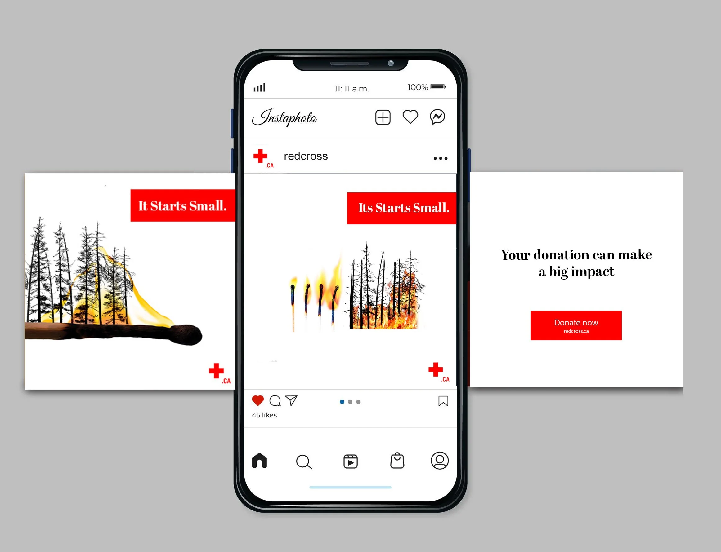 This advertising campaign for the Red Cross addresses the issue of wildfires by visually communicating the fast escalation from small flames to large-scale destruction. Using matchsticks as the main visual metaphor, the posters depict the transformation of a single flame into a blazing fire consuming forests. A burning match progressing to trees guides the viewer through the concept of progression and growth of wildfires. Composition and white space direct attention first to the visuals, then down to the slogan, to communicate the message effectively.